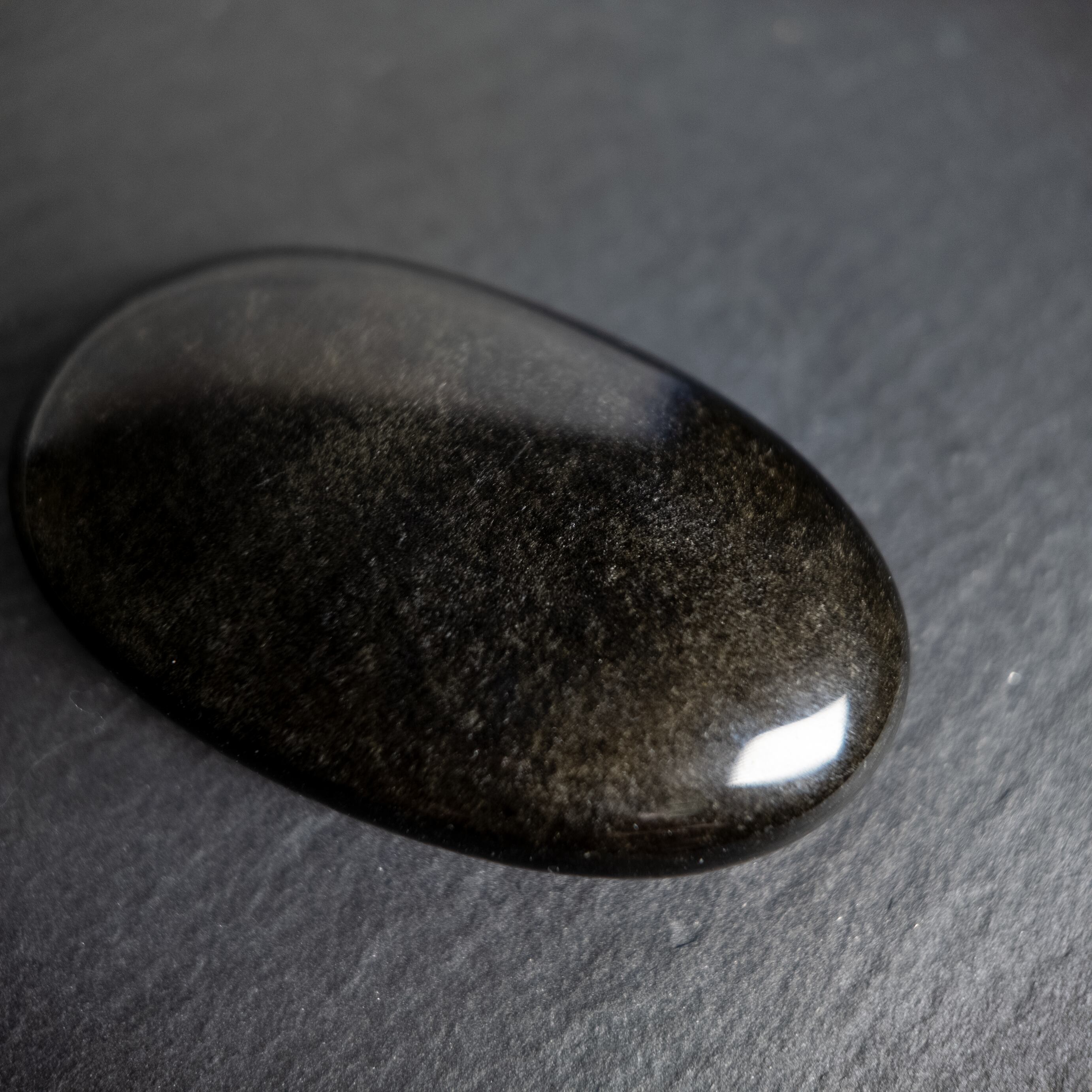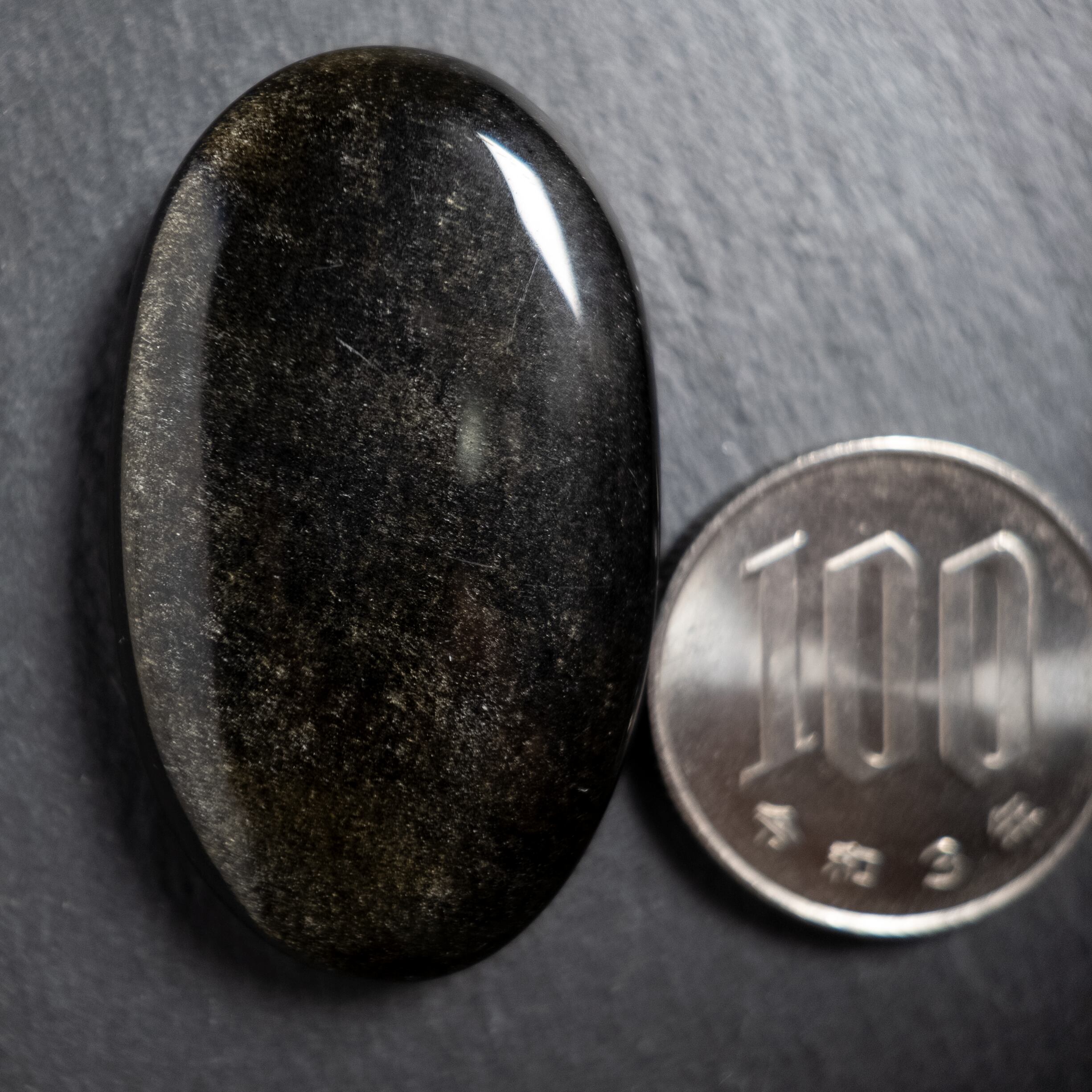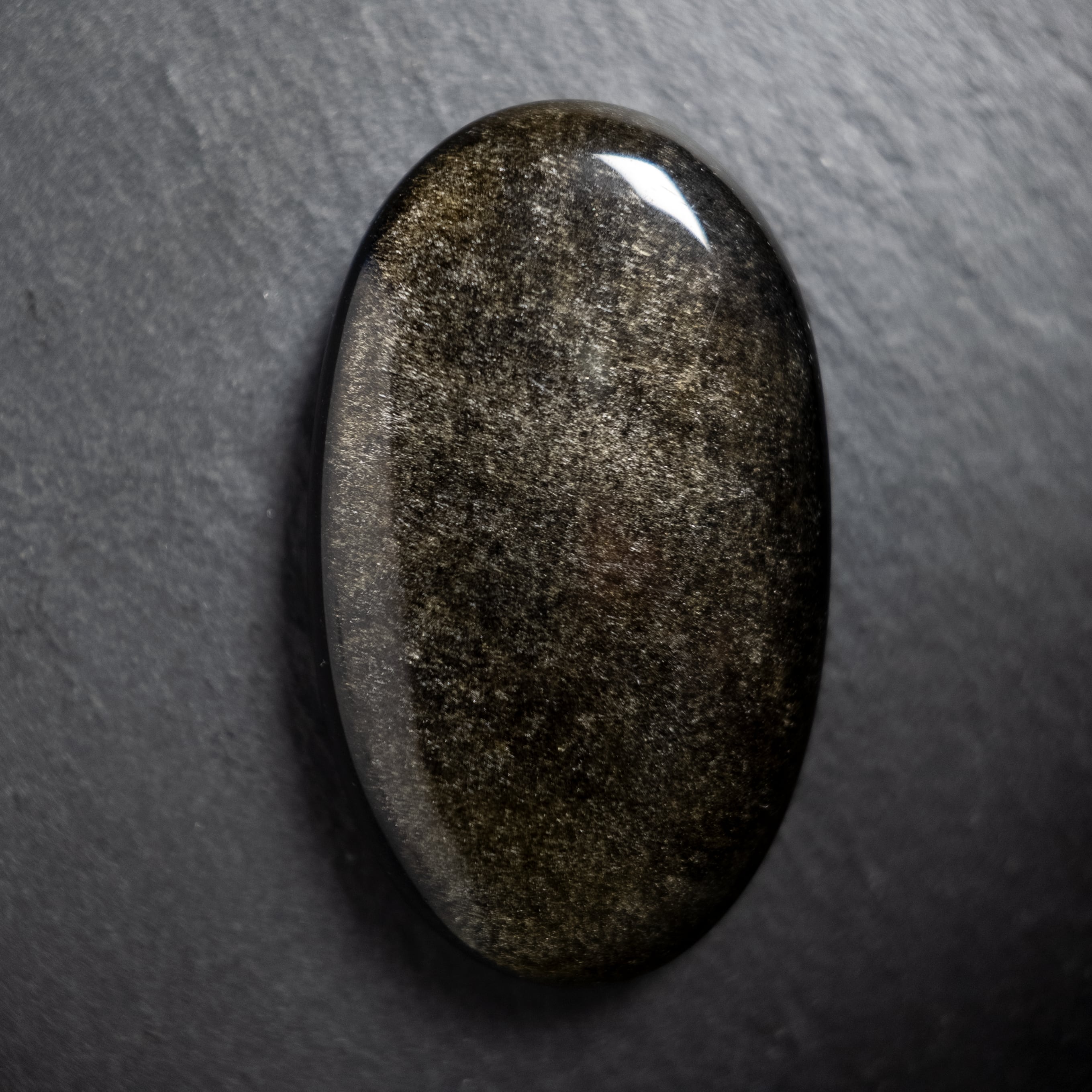 深い黒色をベースに、光の角度によって金色の煌めきが浮かび上がる天然石です。