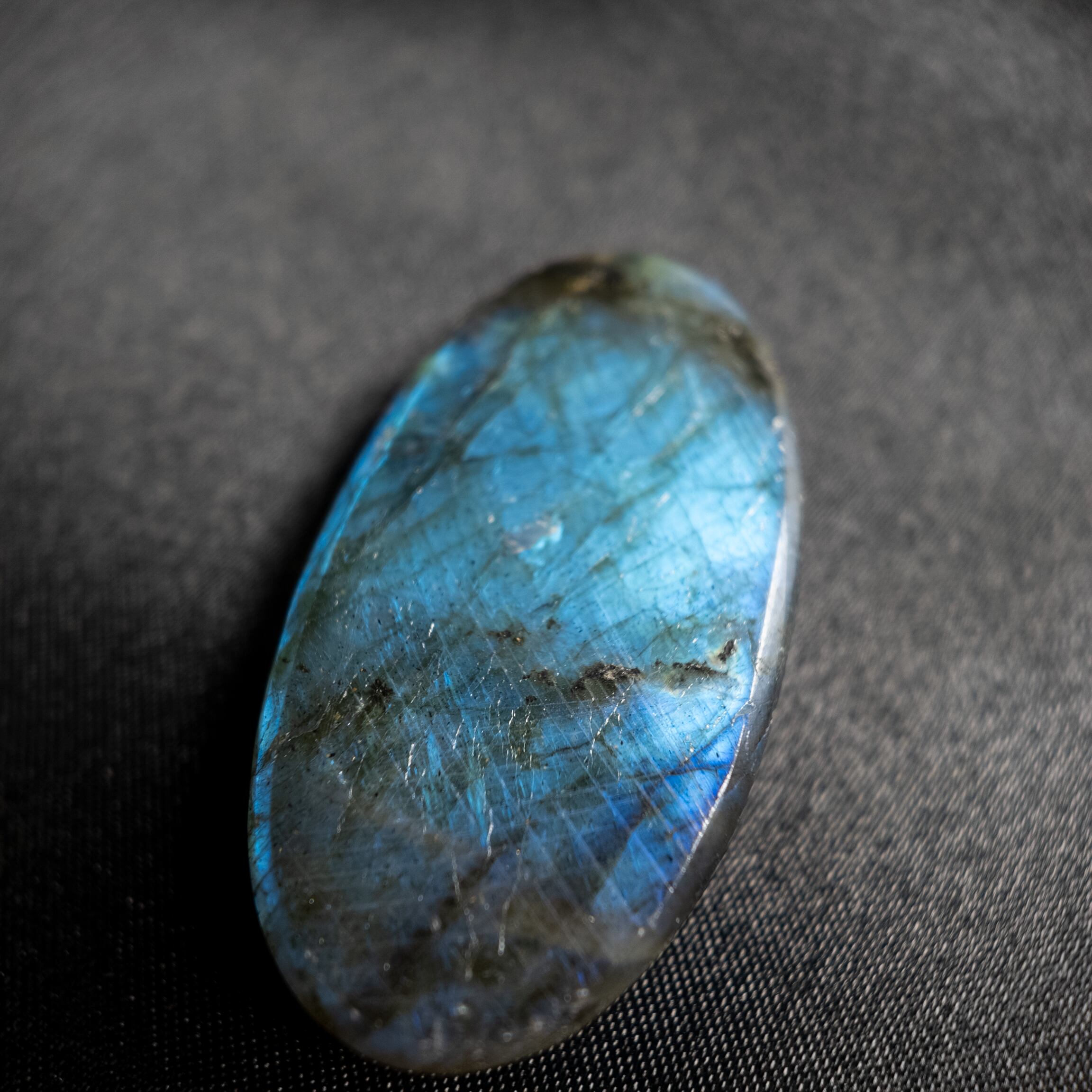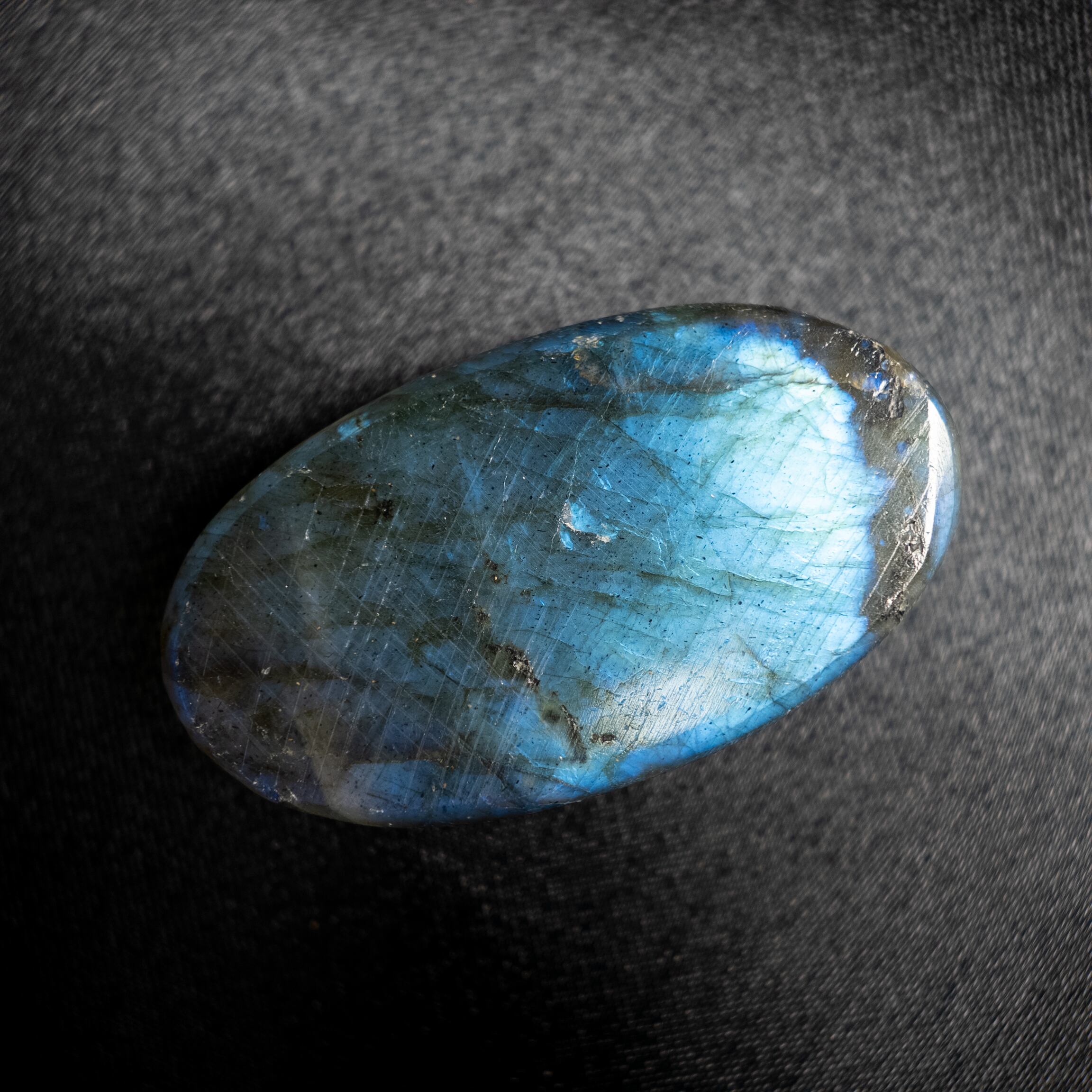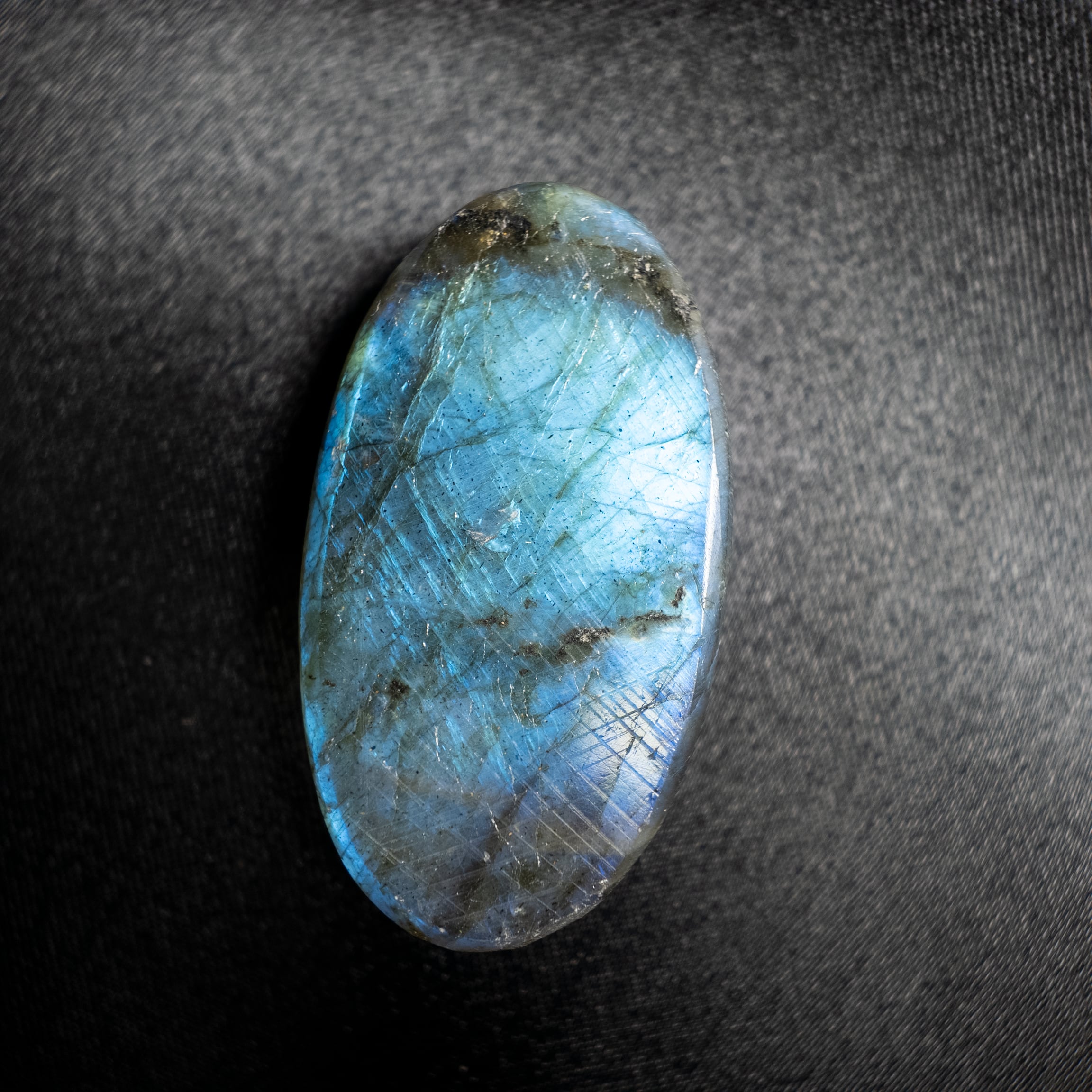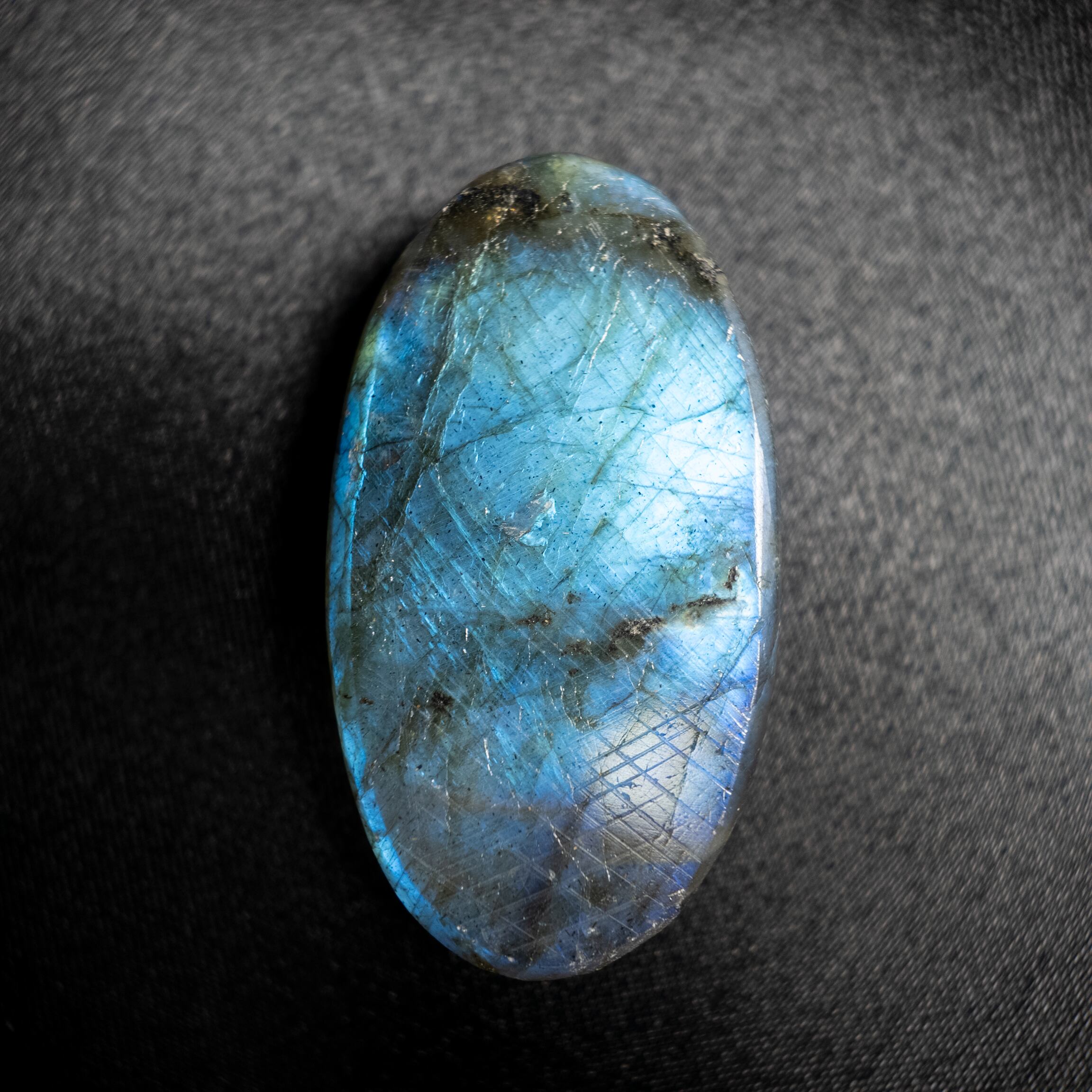 鮮やかなブルーのシラーが美しく浮かび上がるラブラドライトです。