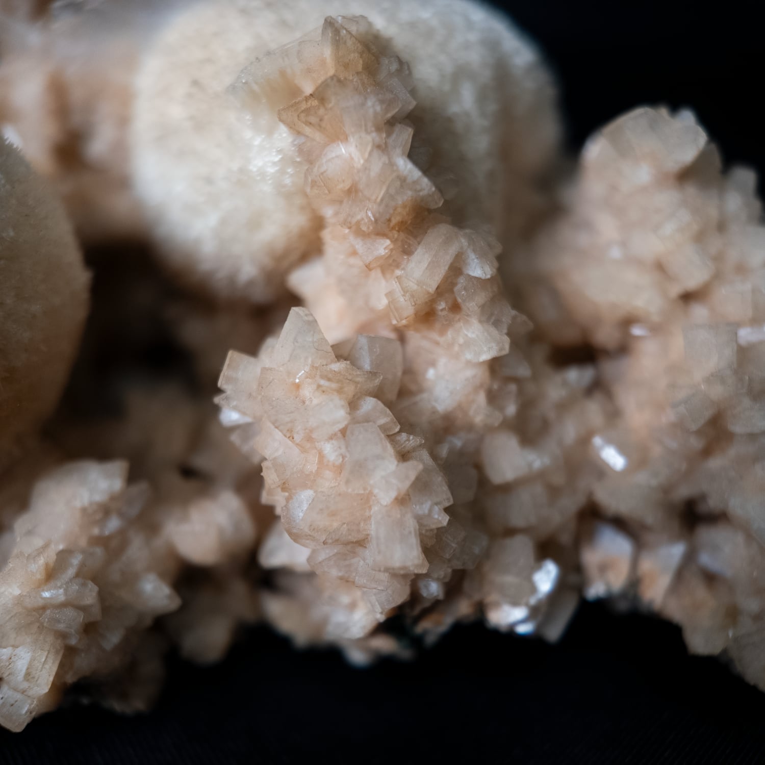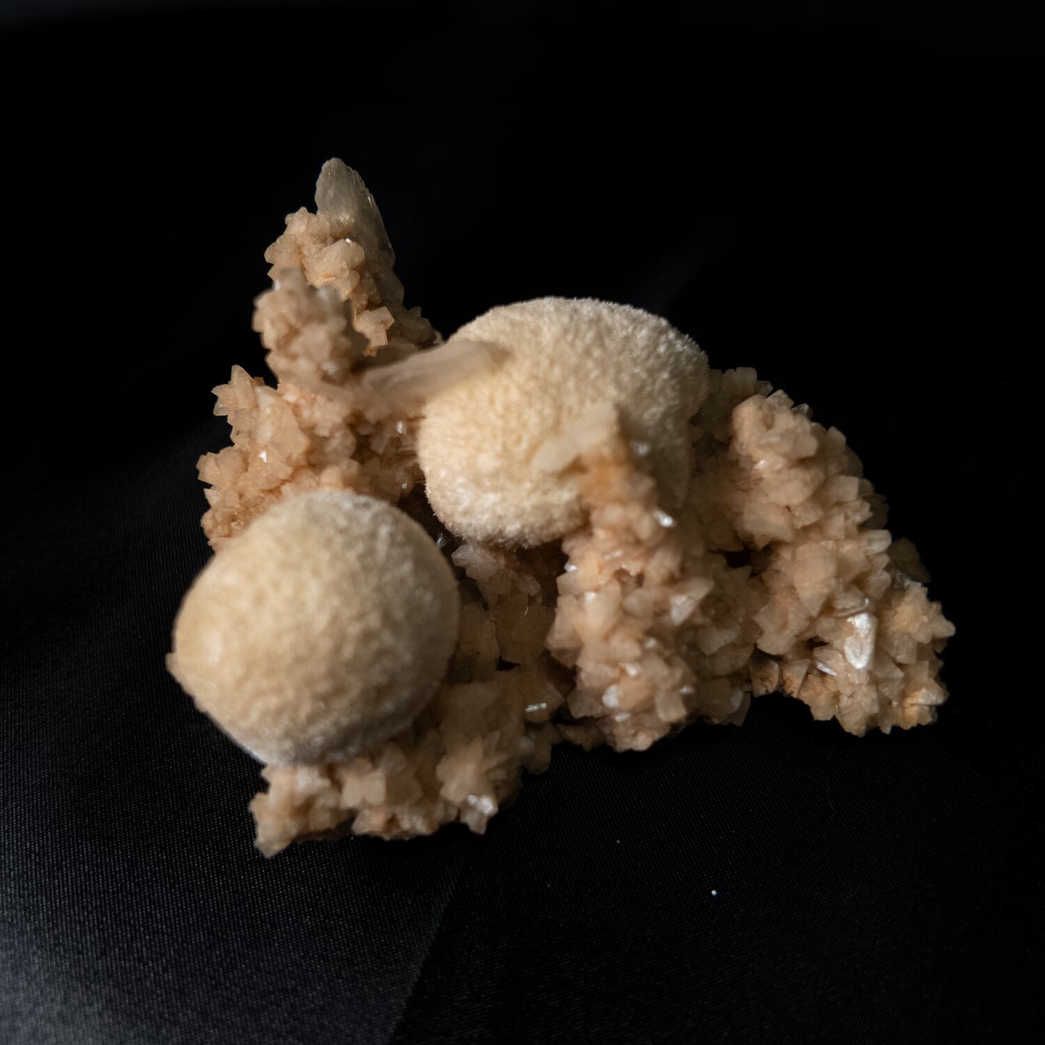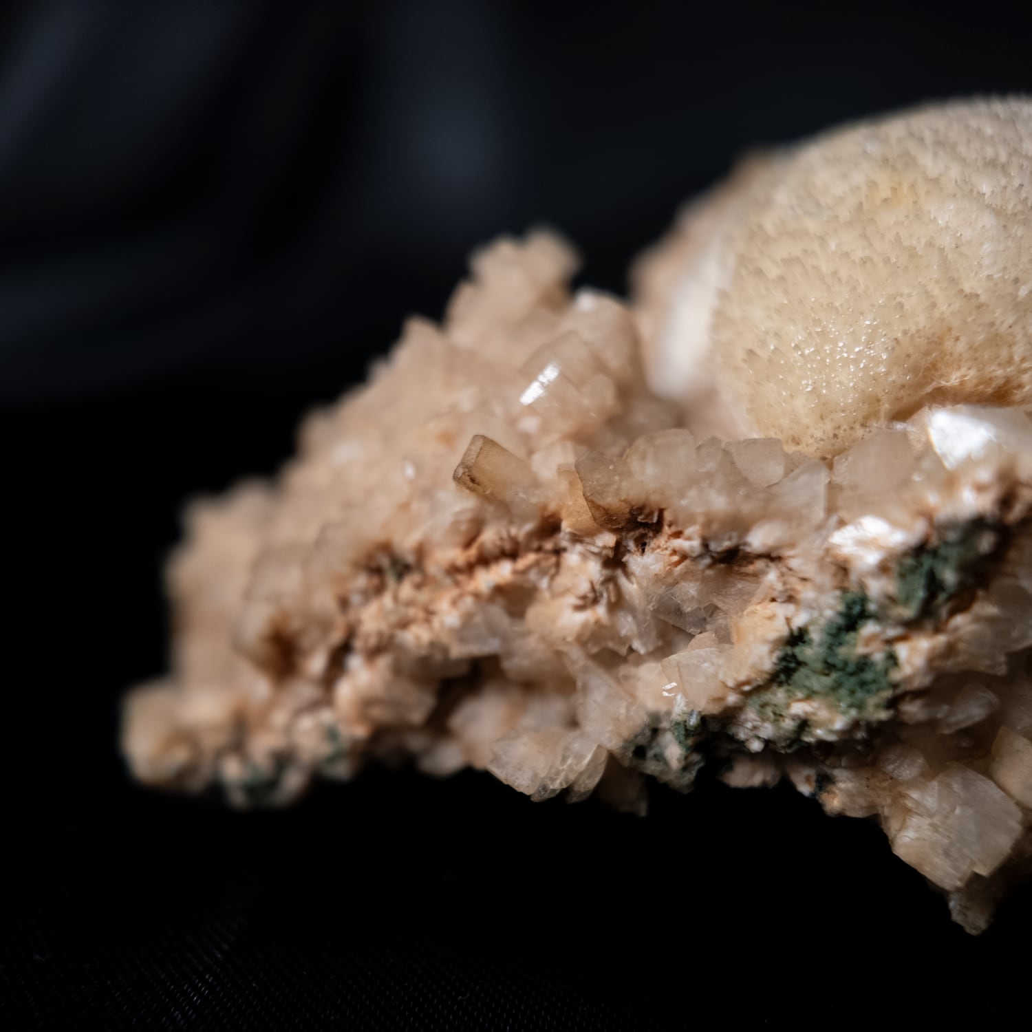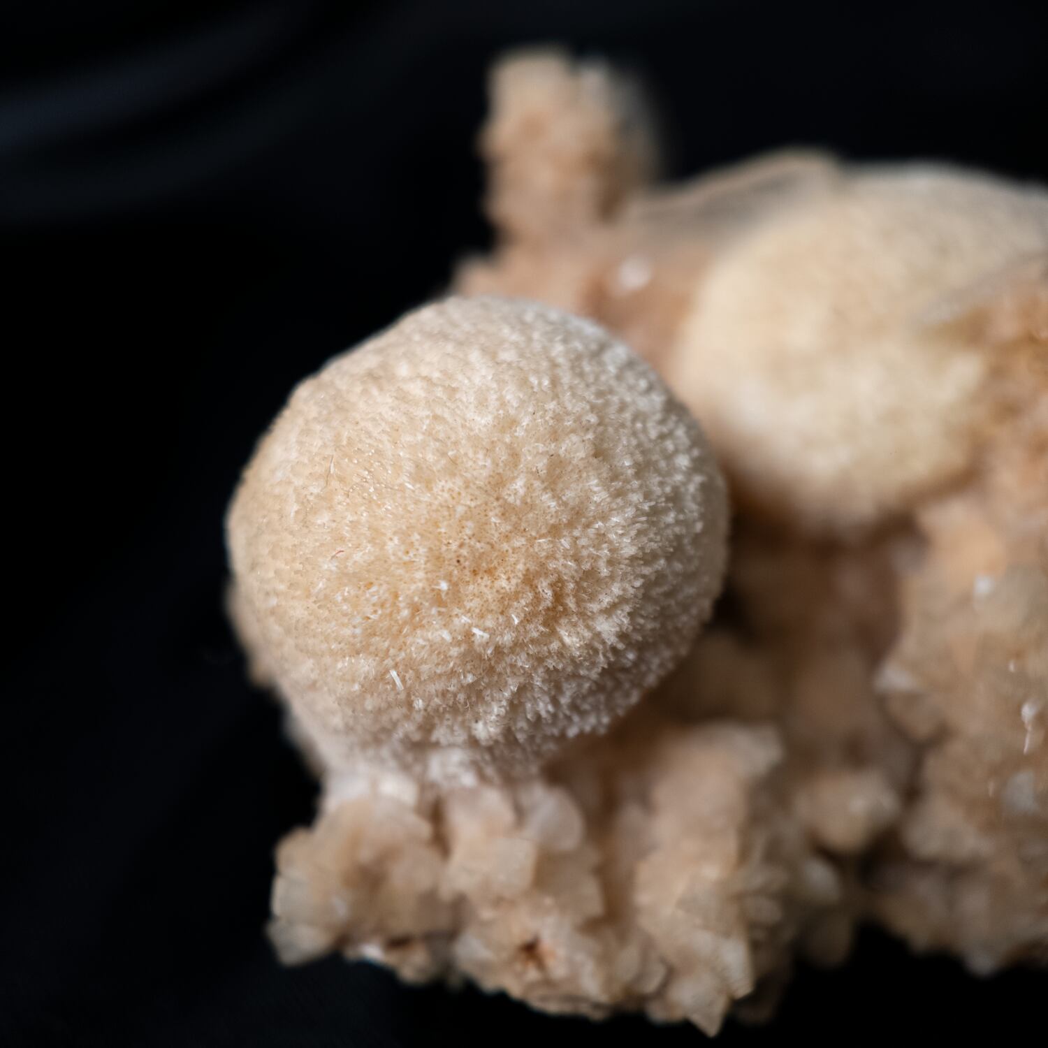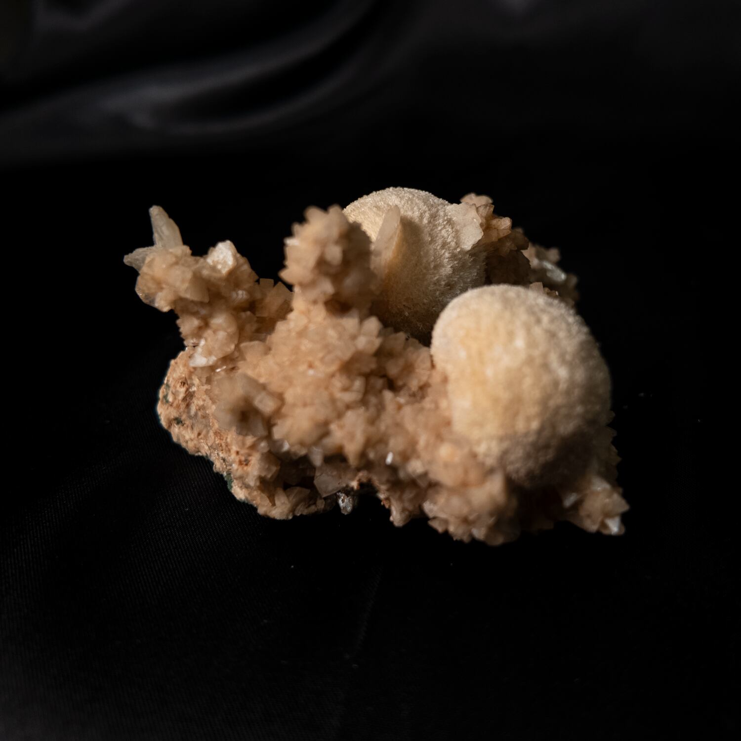 柔らかなベージュ色の母岩の上に、丸く盛り上がるようなトムソナイトの結晶が形成された原石標本。